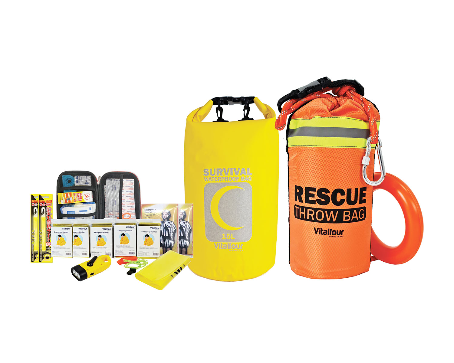 Water rescue kits include throw bags and disaster bags designed for swift and safe rescue in rivers, floods, or water emergencies. Throw bags allow rescuers to reach and pull victims to safety, while disaster bags carry essential survival and first aid supplies. Ideal for rescue teams, lifeguards, and emergency responders.